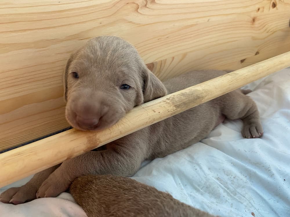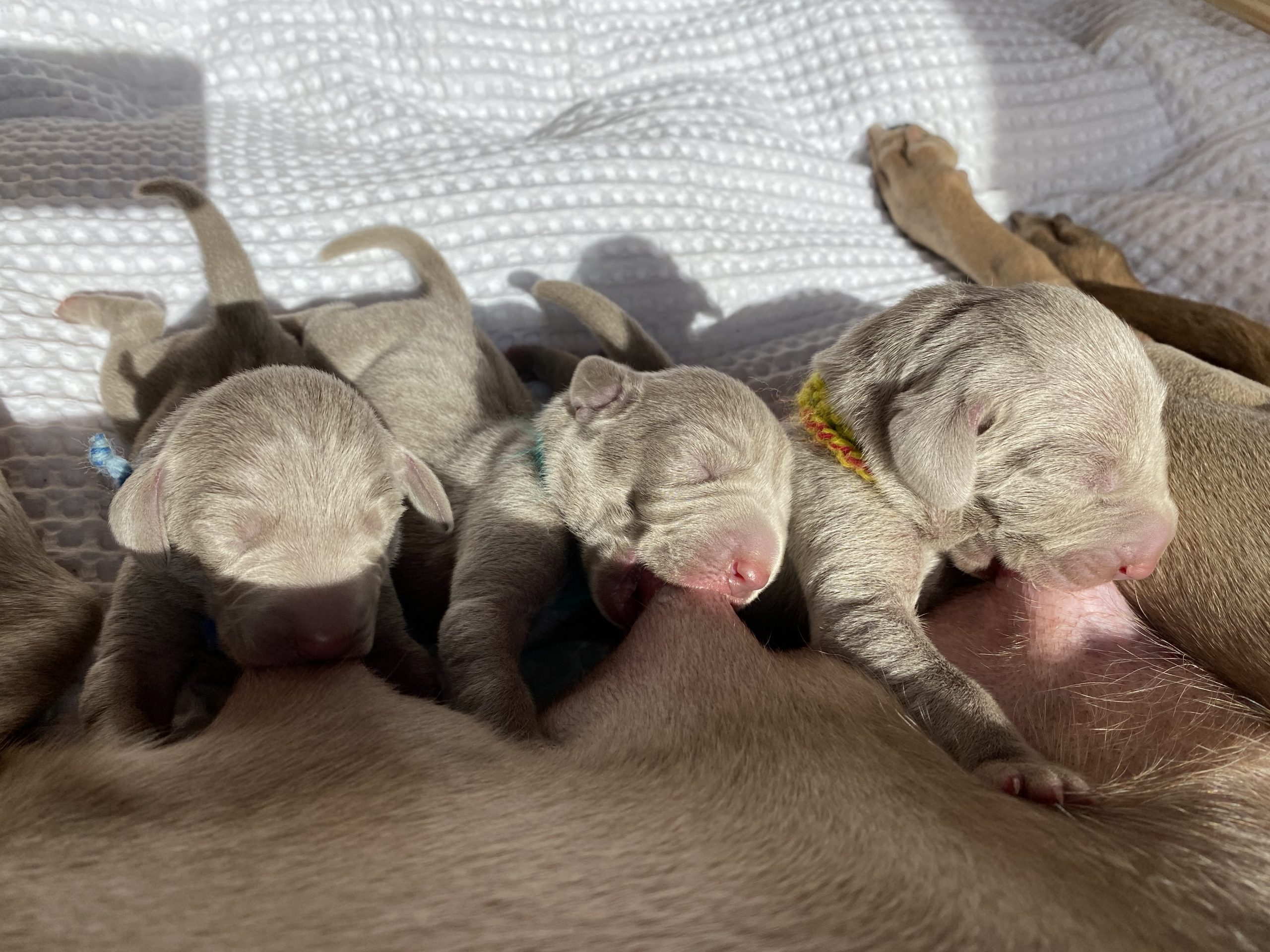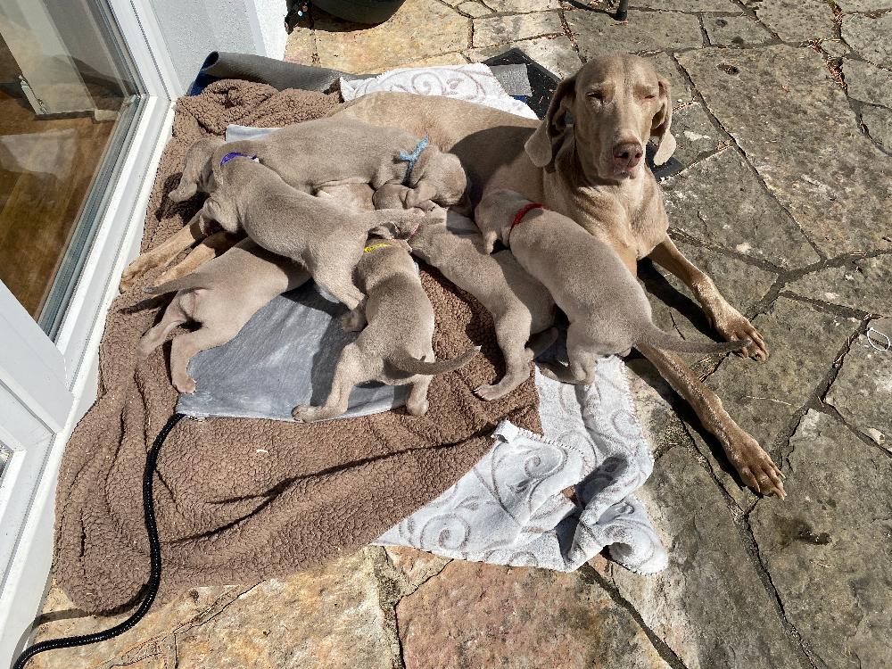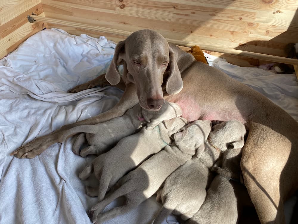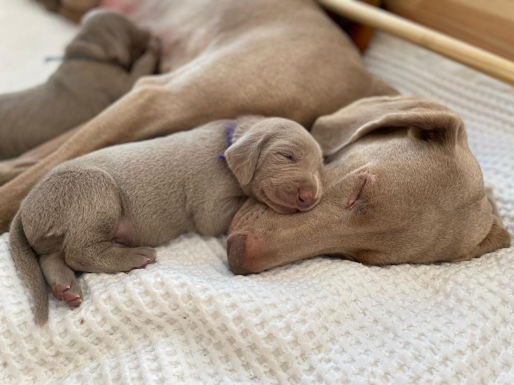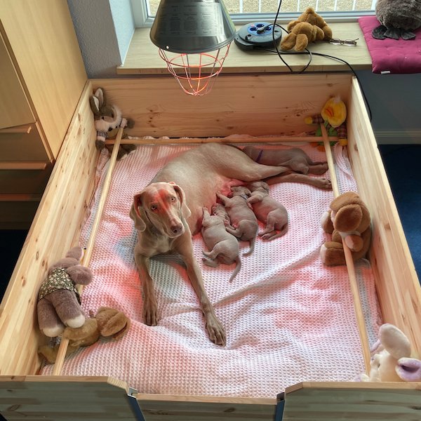 Von Beginn Ihrer Trächtigkeit an hat Chaplin die Wurfbox als ihren bevorzugten Schlaf- und Ruheplatz angenommen. Die Welpen werden hier in den ersten 3 Wochen rund um die Uhr umsorgt. Da die Welpen in den ersten Wochen ihre Körpertemperatur nicht selbstständig regeln können, sorgt die Rotlichtlampe für eine angenehme Wärme.