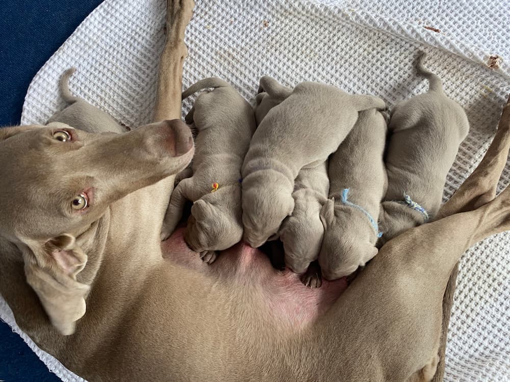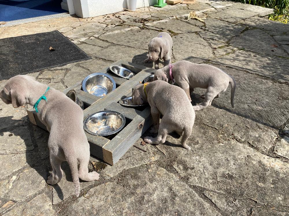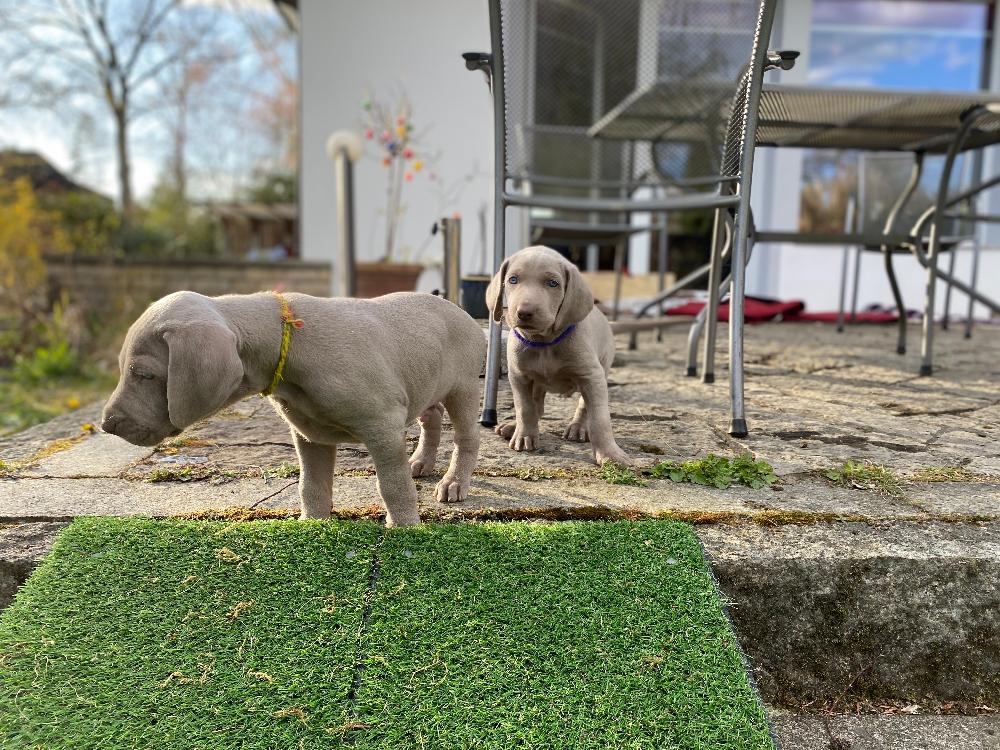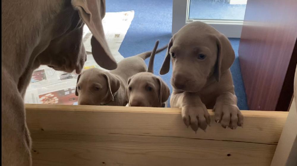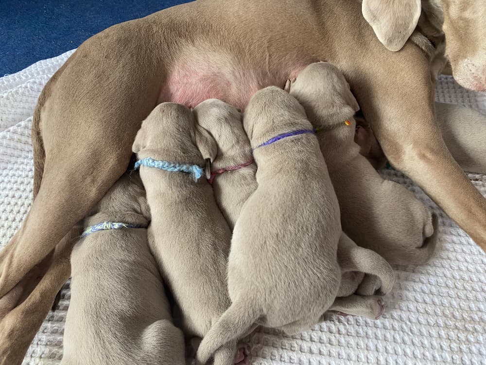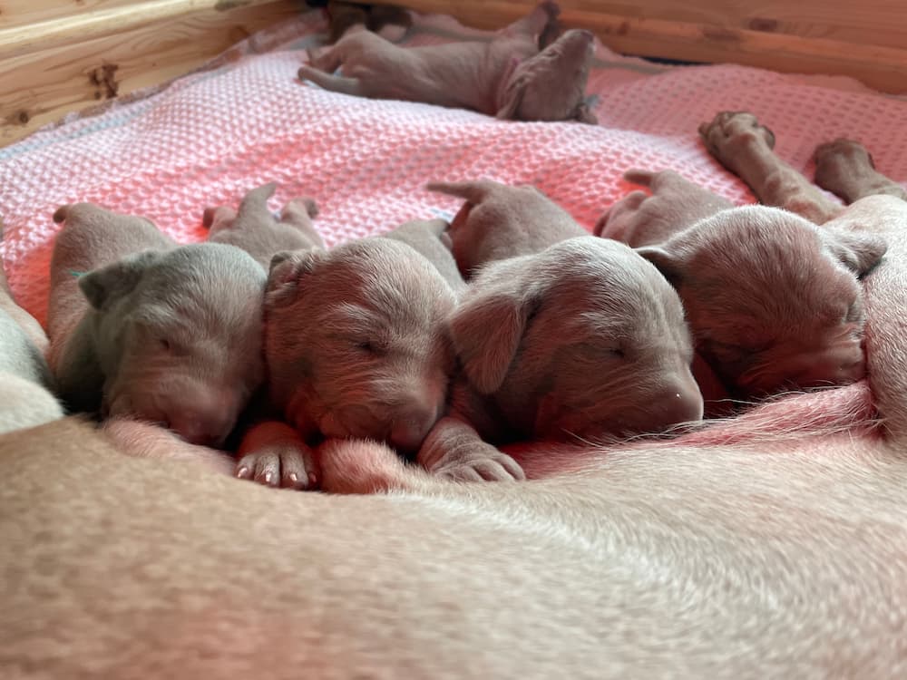 Von Beginn Ihrer Trächtigkeit an hat Chaplin die Wurfbox als ihren bevorzugten Schlaf- und Ruheplatz angenommen. Die Welpen werden hier in den ersten 3 Wochen rund um die Uhr umsorgt. Da die Welpen in den ersten Wochen ihre Körpertemperatur nicht selbstständig regeln können, sorgt die Rotlichtlampe für eine angenehme Wärme.